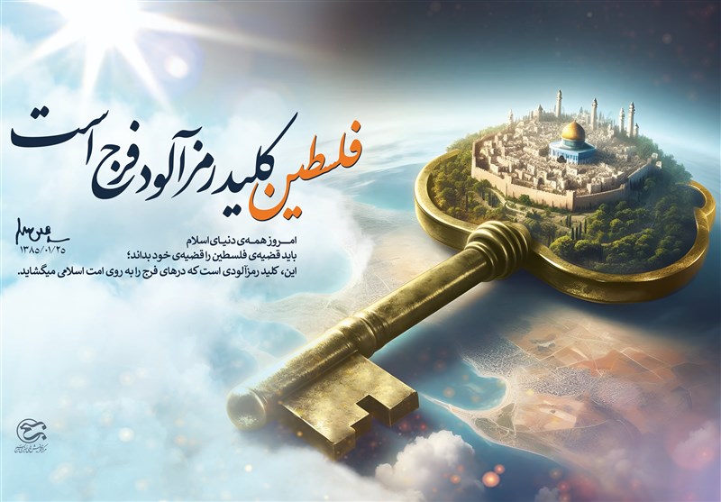 همچنین به خطِ ریزتری روی این پوستر از زبان امام خامنه‌ای نوشته شده: امروز همه‌ی دنیای اسلام باید قضیه‌ی فلسطین را قضیه‌ی خود بداند؛ این، کلیدِ رمزآلودی است که درهای فرج را به روی امت اسلامی می‌گشاید.